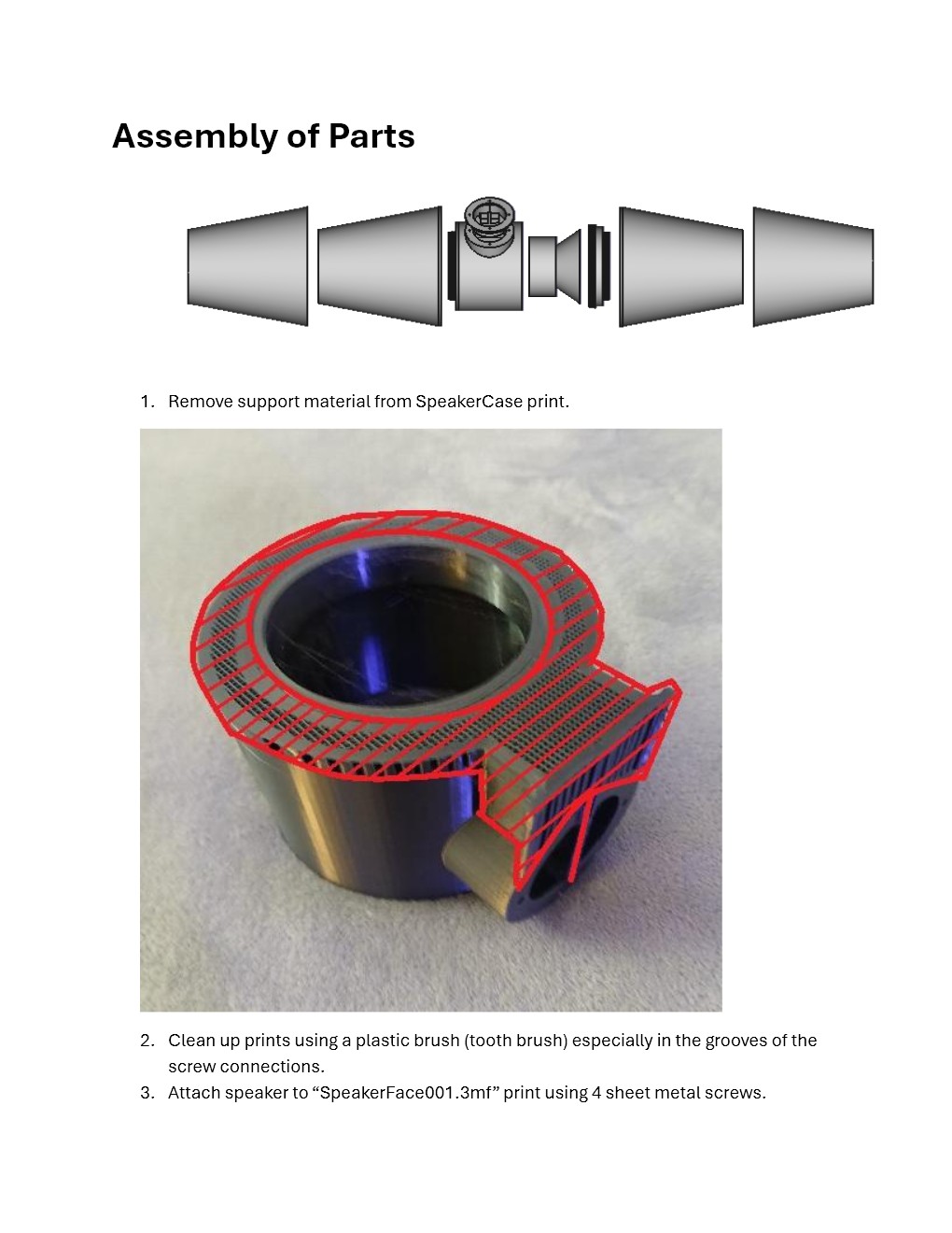 The “4”.3mf files are design to accommodate standard four-inch low frequency drivers with a circular basket. We chose model number: GW-402B/S, SHEILDED 4” 8 ohm Woofer. Required Parts: 3d printer with a 200mm X 200mm bed size 2kozillion meters of filament GW-402B/S, SHEILDED 4” 8 ohm Woofer 8 Screws 3” Speaker Box Cup Detailed assembly instructions (included with download and found on this page) Once printing of parts is complete, attach the woofer, screw the printed parts together, connect the speaker box cup to the speaker then attach to cabinet is basically the full assembly process, ensure to follow detailed assembly instructions. All files are printed in correct orientation with one file needing support 50 degree from the plate and another file must be rotated 180 degree.