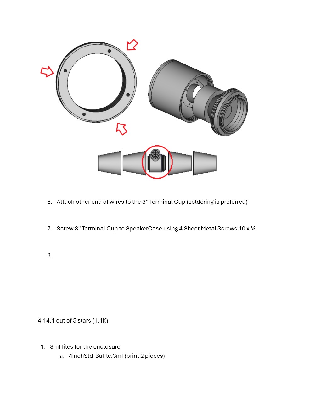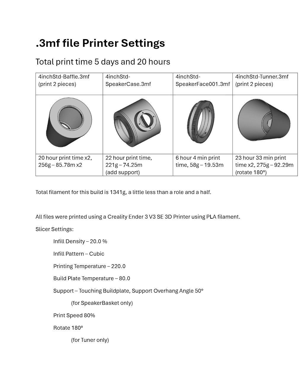 The “4”.3mf files are design to accommodate standard four-inch low frequency drivers with a circular basket. We chose model number: GW-402B/S, SHEILDED 4” 8 ohm Woofer. Required Parts: 3d printer with a 200mm X 200mm bed size 2kozillion meters of filament GW-402B/S, SHEILDED 4” 8 ohm Woofer 8 Screws 3” Speaker Box Cup Detailed assembly instructions (included with download and found on this page) Once printing of parts is complete, attach the woofer, screw the printed parts together, connect the speaker box cup to the speaker then attach to cabinet is basically the full assembly process, ensure to follow detailed assembly instructions. All files are printed in correct orientation with one file needing support 50 degree from the plate and another file must be rotated 180 degree.
